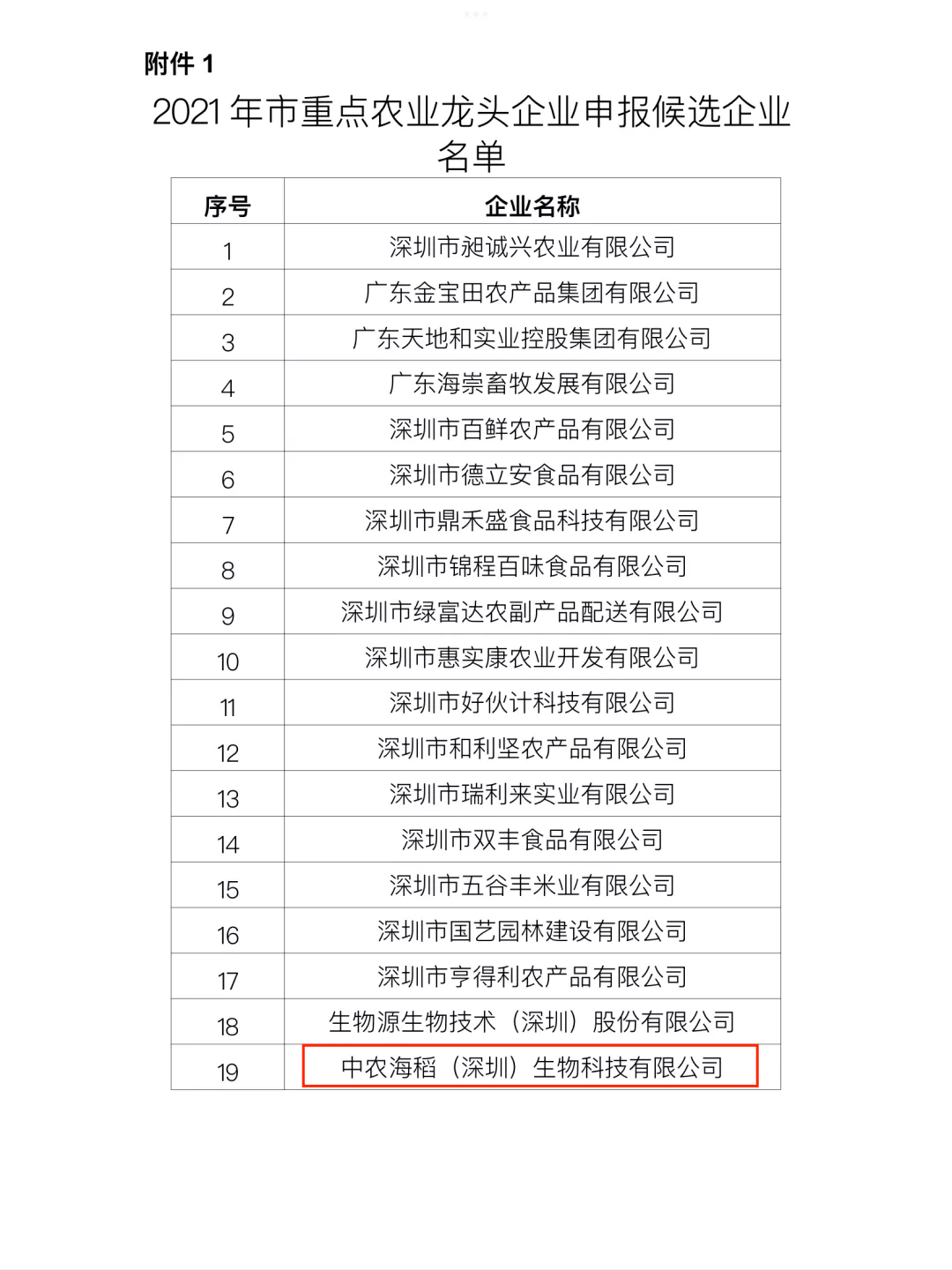 2022年1月30日,深圳市市場監(jiān)督管理局公示了2021年市重點(diǎn)農(nóng)業(yè)龍頭企業(yè)評審結(jié)果,中農(nóng)海稻公司成功入選。
